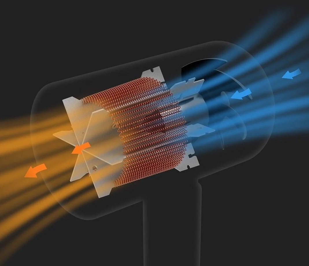 Скорость потока воздуха, подаваемого феном Xiaomi, достигает 15 м/с. Внутри установлен аэродинамический вентилятор. С помощью высокопроизводительного двигателя подаются сильные воздушные потоки, волосы сушатся быстро без высоких температур.