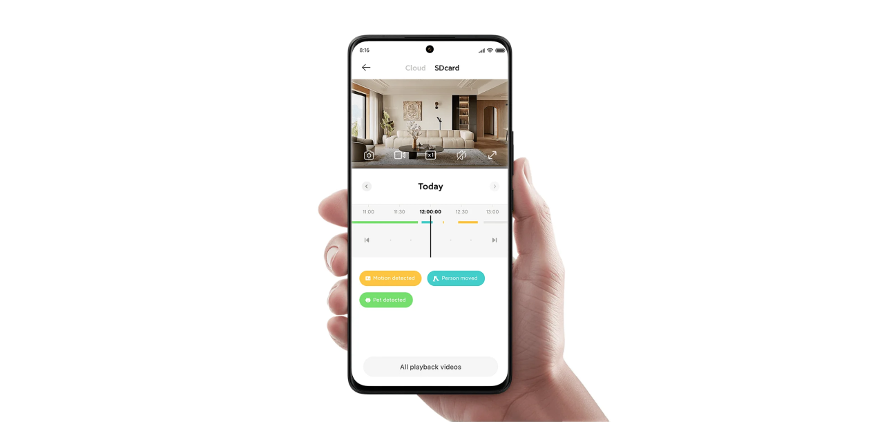Камера поддерживает обнаружение движения и отправляет уведомления при активности в кадре. Видеоархив может сохраняться как в облачное хранилище, так и на карту памяти, что дает гибкость в выборе способа хранения данных.